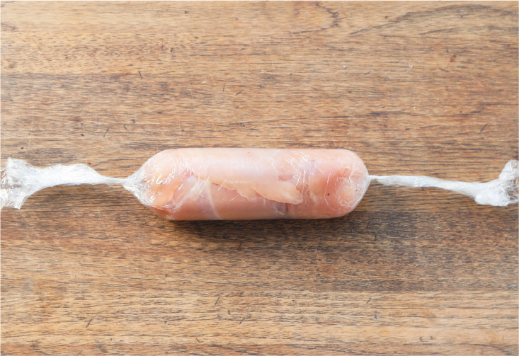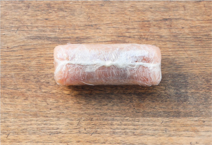 ラップを大きめに広げて鶏肉ロールを手前にのせ、ラップをぴっちりと巻きつけたら、ラップの両端をねじり、ねじった部分を中央で結ぶ。