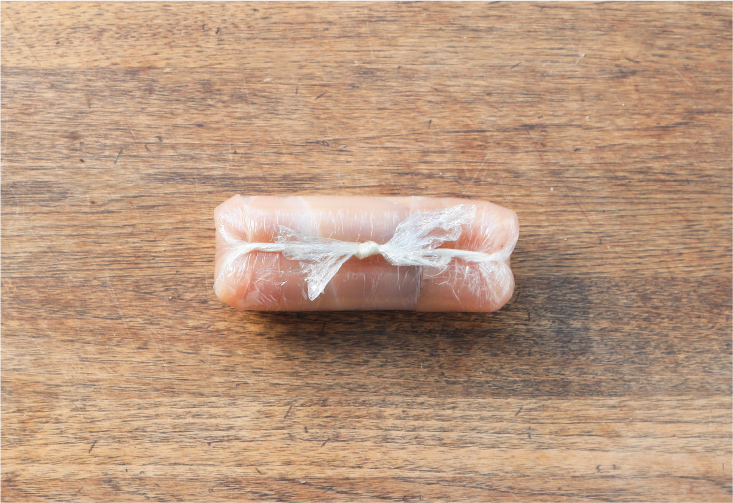 [スモークチーズイン鶏ハム]はラップをぴっちり巻くのがポイント。