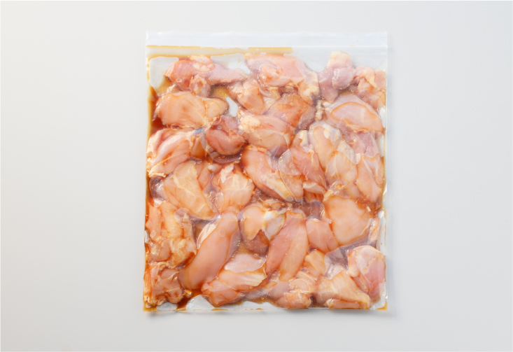 鶏もも肉は皮を取り除き、脂肪や血管なども丁寧に取り除く。食べやすいサイズに薄くスライスする。熱湯で湯せんができる保存袋に、スライスした鶏肉をなるべく平らに並べて入れ、混ぜ合わせた[材料B]を加えて空気を抜くように封をする。平らに置き常温で10分おく。