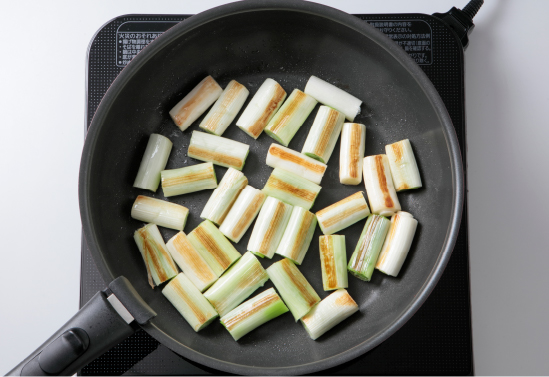 フライパンにサラダ油を入れて弱中火にかけ、❶の筒切りにした長ねぎを入れて、焼き色がつくまで転がしながら焼いて取り出す。
