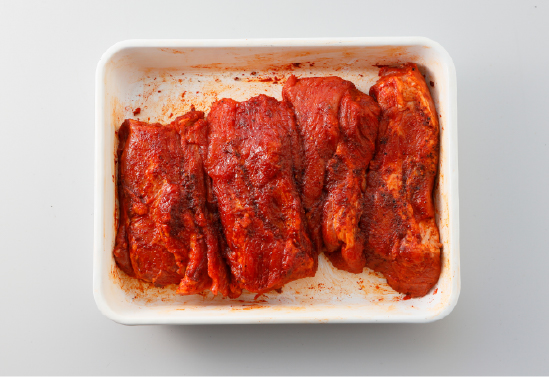 豚肉は400gの塊を2つ用意する。肉の繊維に沿って縦に2等分する。下味が入りやすいように、豚肉の表面をフォークで満遍なく刺す。バットに豚肉を並べ表面に[材料A]の調味料を擦り込み、ラップをして冷蔵庫で1時間おく。所定の時間が経過したら、冷蔵庫から出し調理前に豚肉を常温に戻しておく。