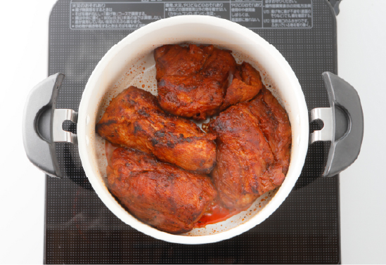 調理鍋にサラダ油を熱して❶の豚肉を入れ、全面に焼き色をつけて一旦取り出しておく。