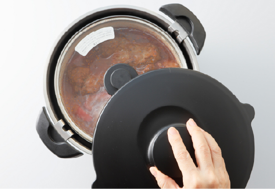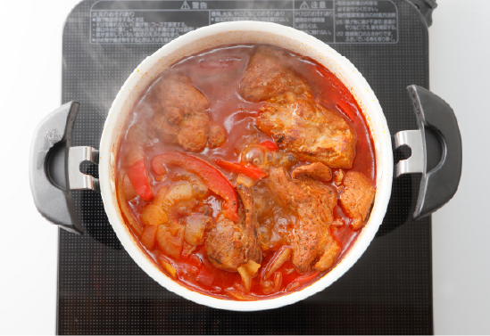 調理鍋に❶の玉ねぎとパプリカを敷き、豚肉を戻し入れて[材料B]を加え加熱する。沸とうしたらあくを取り、火を弱める。フタをして15分加熱する。