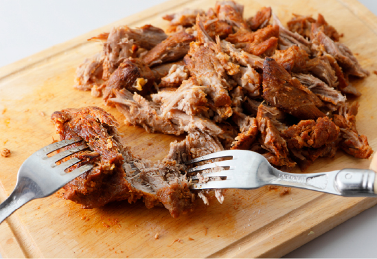 所定の時間が経過したら、豚肉を取り出しフォークを2本使って肉の繊維に沿って引っ張ってほぐす。