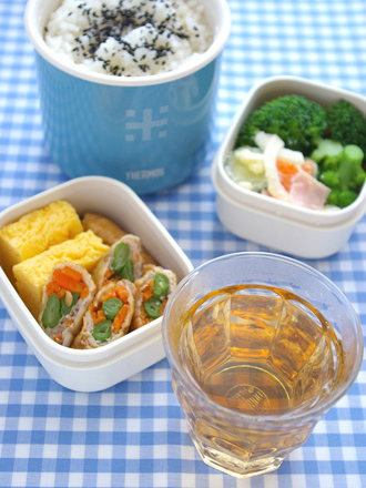 コーン茶&豚肉ロール巻きと厚焼き卵のお弁当