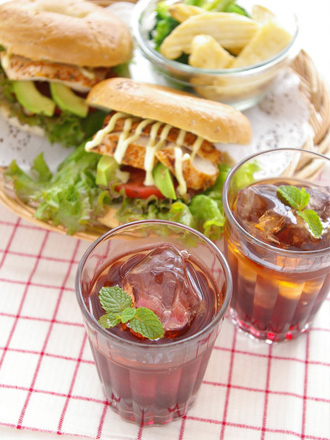 グレープアイスティー&ケイジャンチキンのベーグルサンド