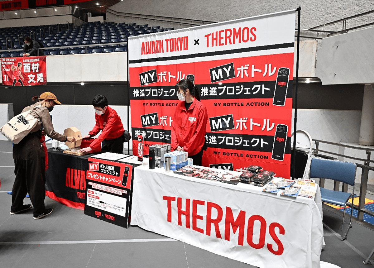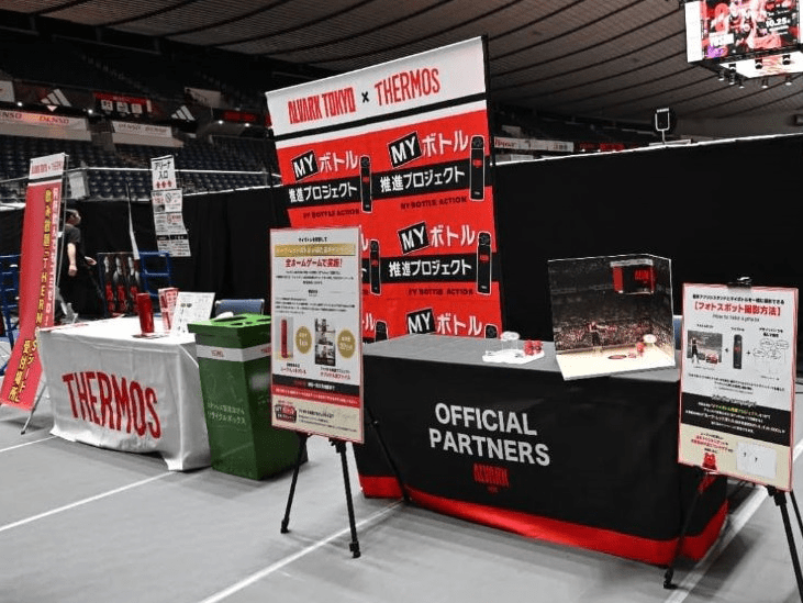 ペア席のサーモスシートを、国立代々木競技場第一体育館で行われたホームゲームで販売。808杯分の使い捨てドリンク容器の削減につながりました。【使用済みステンレス製魔法びんの回収】