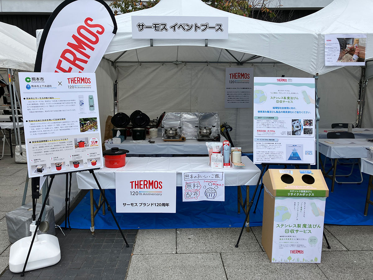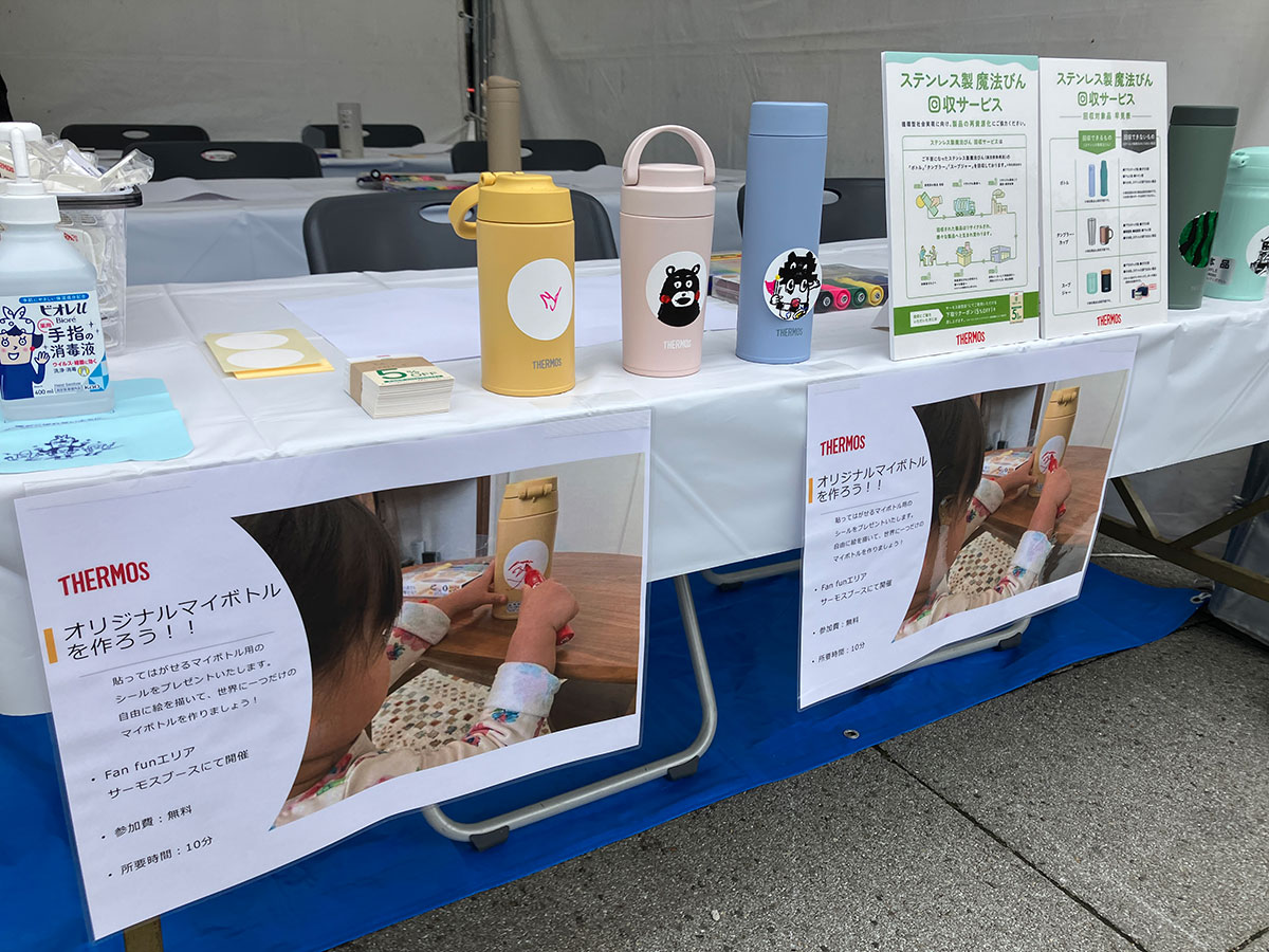 再資源化を目指し、サーモス特設ブースに回収ボックスを設置。ご不要の「使用済みステンレス製魔法びん」を回収しました。回収した製品は、粉砕・選別などの処理を行い、再生材としてさまざまな製品の素材に再利用されます。<活動実績>