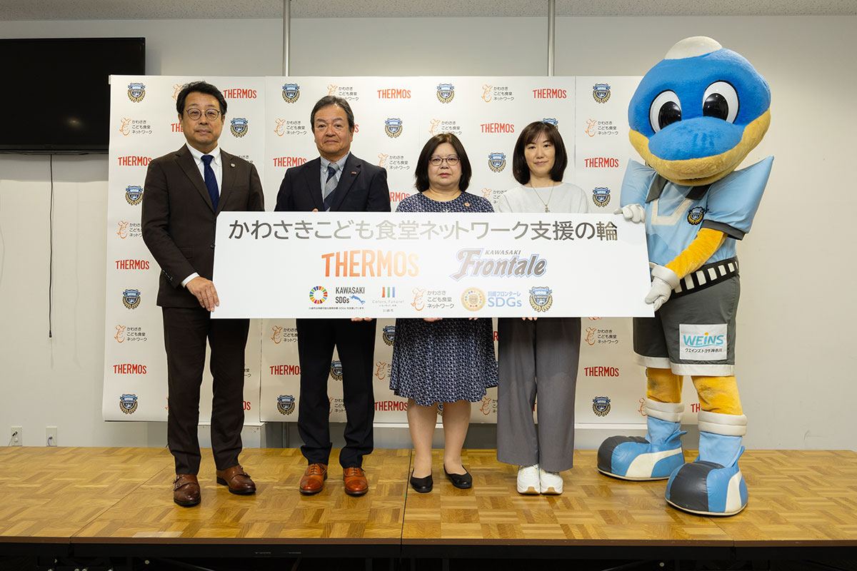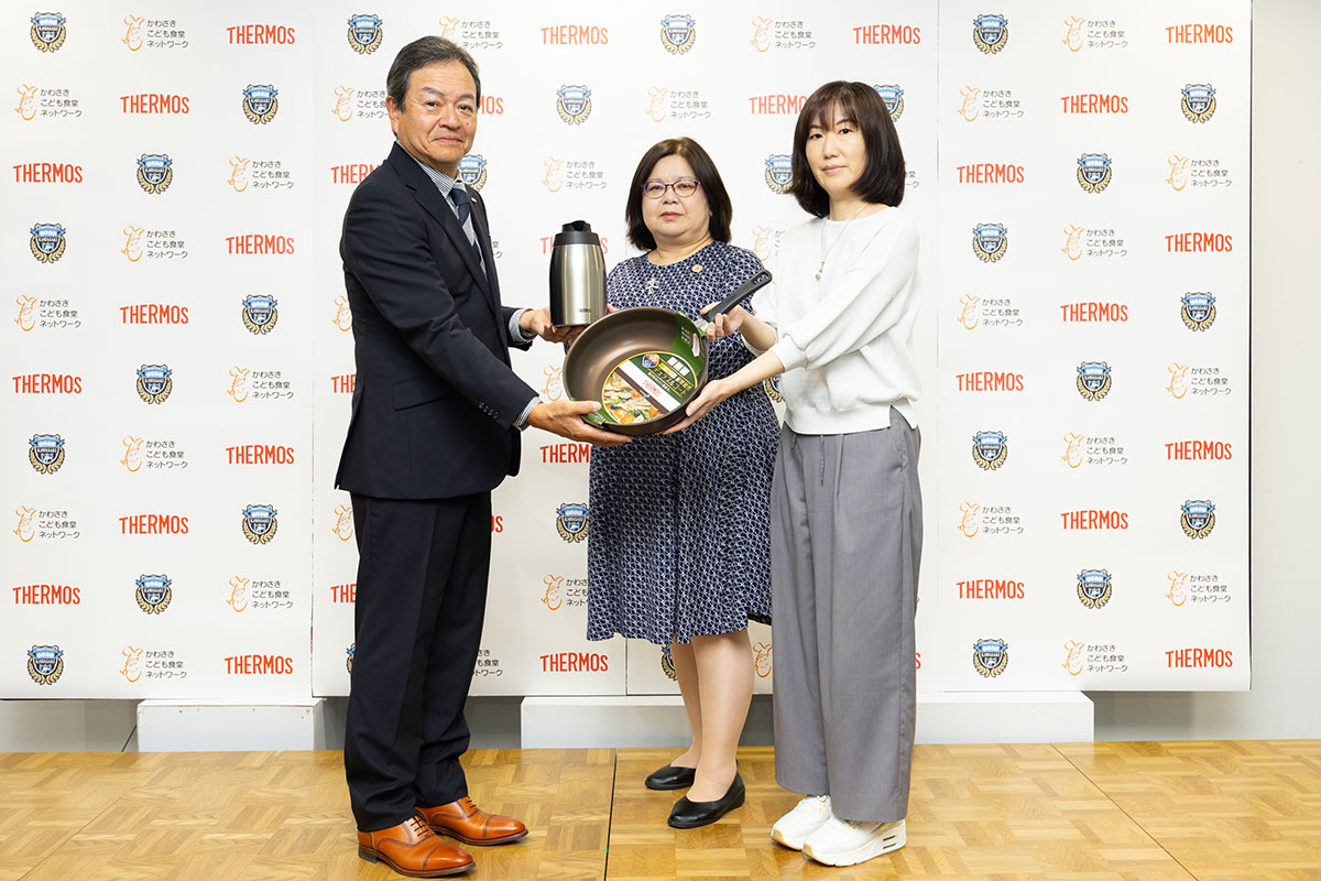 当社がオフィシャルパートナーとしてサポートしているプロサッカーチームである川崎フロンターレと連携し、こども食堂が抱える調理の効率化などの課題解決を支援するため、ステンレスポットやフライパン、真空保温調理器などの製品を寄贈。地域社会との共創を通じ、持続可能な社会の実現を目指しています。