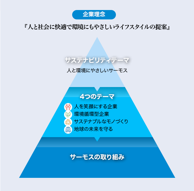 私たちは企業理念のもと、未来にあるべきサーモスの姿として、「人と環境にやさしいサーモス」というサステナビリティテーマを掲げています。さらに具体的な4つのテーマを指針とし、私たちが未来に向けて取り組むべきSDGsへの貢献活動を規定しています。