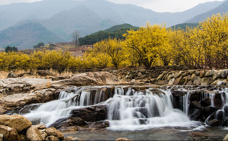また、梅と並んで喜ばれる花が山茱萸(サンシュユ)です。日本でも庭木として好まれる山茱萸。秋に実る赤い実は、漢方の生薬にもなります。春先に咲く花は鮮やかな黄色で、咲き誇る花々は陽光のよう。なかでも全羅南道の求礼(クレ)群で催される「求礼山茱萸花祭り」は、黄金色に染まった智異山(チリサン)に人々が集います。