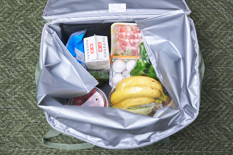 「はい。保冷買い物カゴ用バッグなども展開しています。大手スーパーのレジカゴの平均的な大きさを調査して、フィットするサイズを用意しました。RFG-025シリーズは内側にフラップ生地(内側上部の生地)がついているのが特徴で、しっかり保冷できます。サイドに持ち手がついているので、荷物が多くなったときも持ち運びがラクチンです」