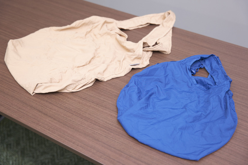 「そうですね。保冷機能はないのですが、こちらのたたまず丸めるエコバッグも人気ですよ。エコバッグって、使った後にきれいにたたむのが面倒だったりするじゃないですか。でもこのRFLシリーズは、くしゅくしゅっと丸めるだけでコンパクトにしまえるんです。カバンにも常備しやすいですし、洗濯機で洗うこともできるので、清潔に長く使えますよ」