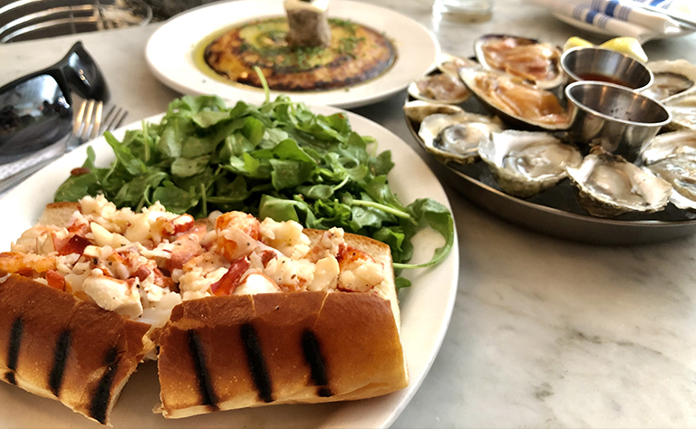一尾だけでは足りないのでしょうか、ほぐしたロブスターの身をパンにはさんだ「ロブスターロール」も人気メニューです。生牡蠣もシュリンプカクテルも、これでもかというくらい出てきます。