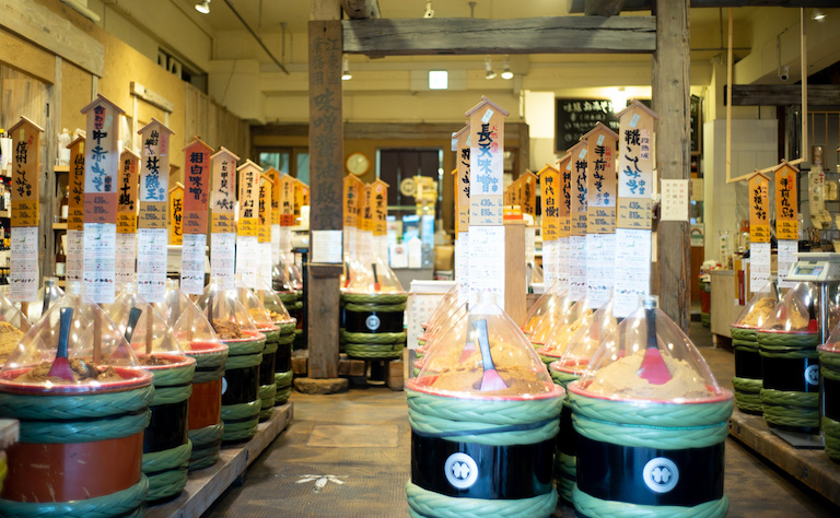 大きな樽がずらっと並ぶ「佐野みそ・亀戸本店」。全国各地から厳選した味噌の種類は、店舗奥に保管している味噌まであわせると、70種類以上とのこと!