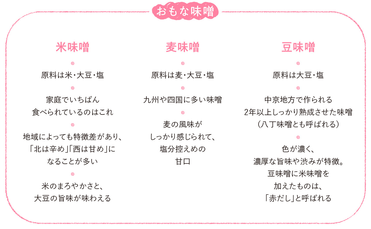 味噌は、麹の種類、大豆の加熱方法、塩の割合、熟成期間、気候風土、発酵熟成中に働く微生物の力などによって、多種多様な風味と味わいが生まれます。その原料は、大きく分けて3種類。