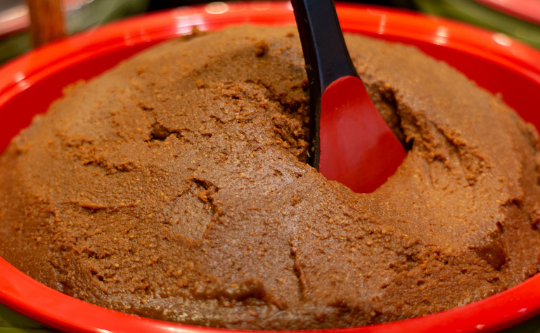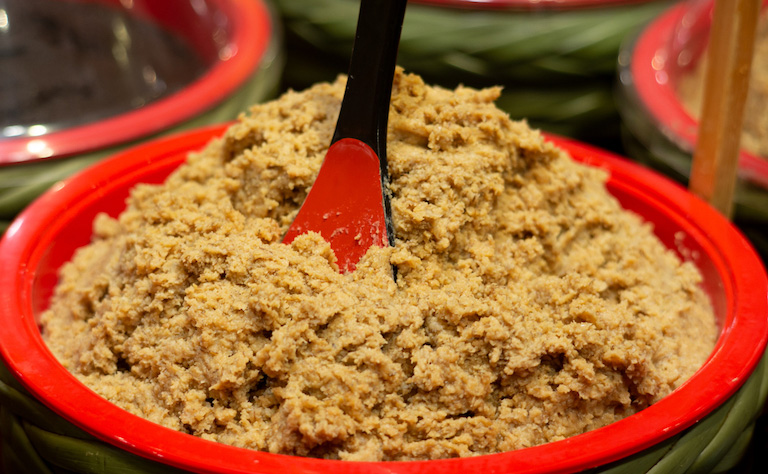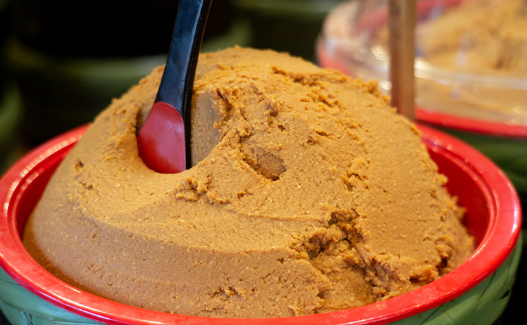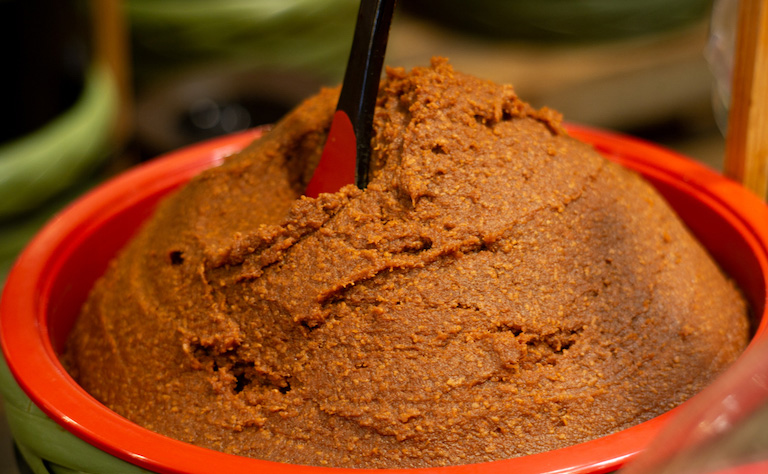 九州産の大豆を自然塩で仕込んでいて、麦麹の甘みと深い香りが楽しめます。カボチャ、さつまいも、かぶ、白菜など甘みのある野菜にぜひ合わせてみてください。櫻島をベースにする場合は、先ほどご紹介した『神代みそ(赤)』をちょい足しするのもおいしいですよ。