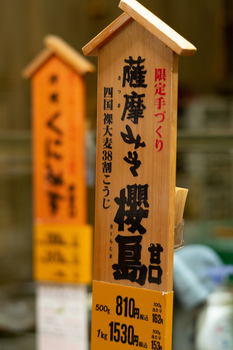 高山さんのイチオシは、四国産の裸大麦を通常の4倍と贅沢に使った麦味噌「薩摩みそ 櫻島(甘口)」。