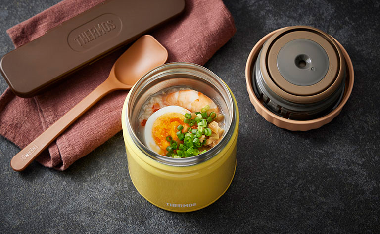 調理のときも、鍋で煮込まずにスープジャーで「保温調理」すれば洗い物もグンと楽に! そのまま保温しておけば、温かいランチにもなります。