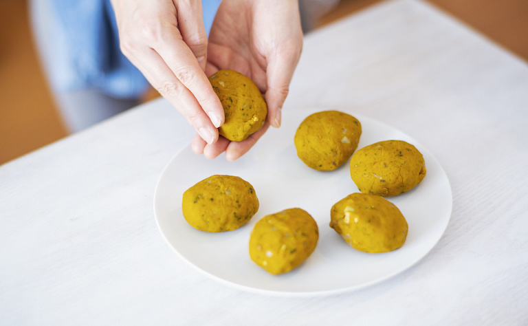 さらにもう1品「かぼちゃとくるみのコロッケ」のレシピも教えていただきます。メニュー名にもあるくるみのほか、味噌も隠し味で入っているそう。