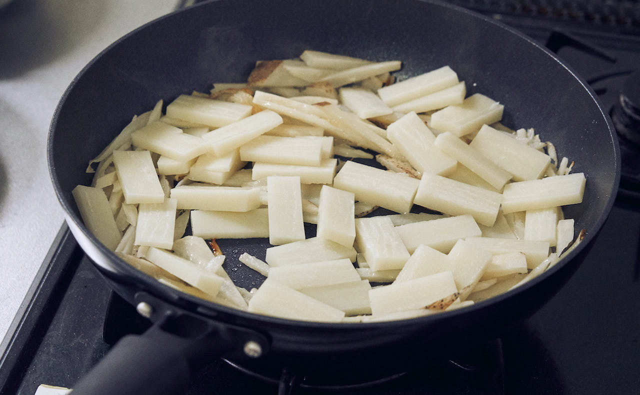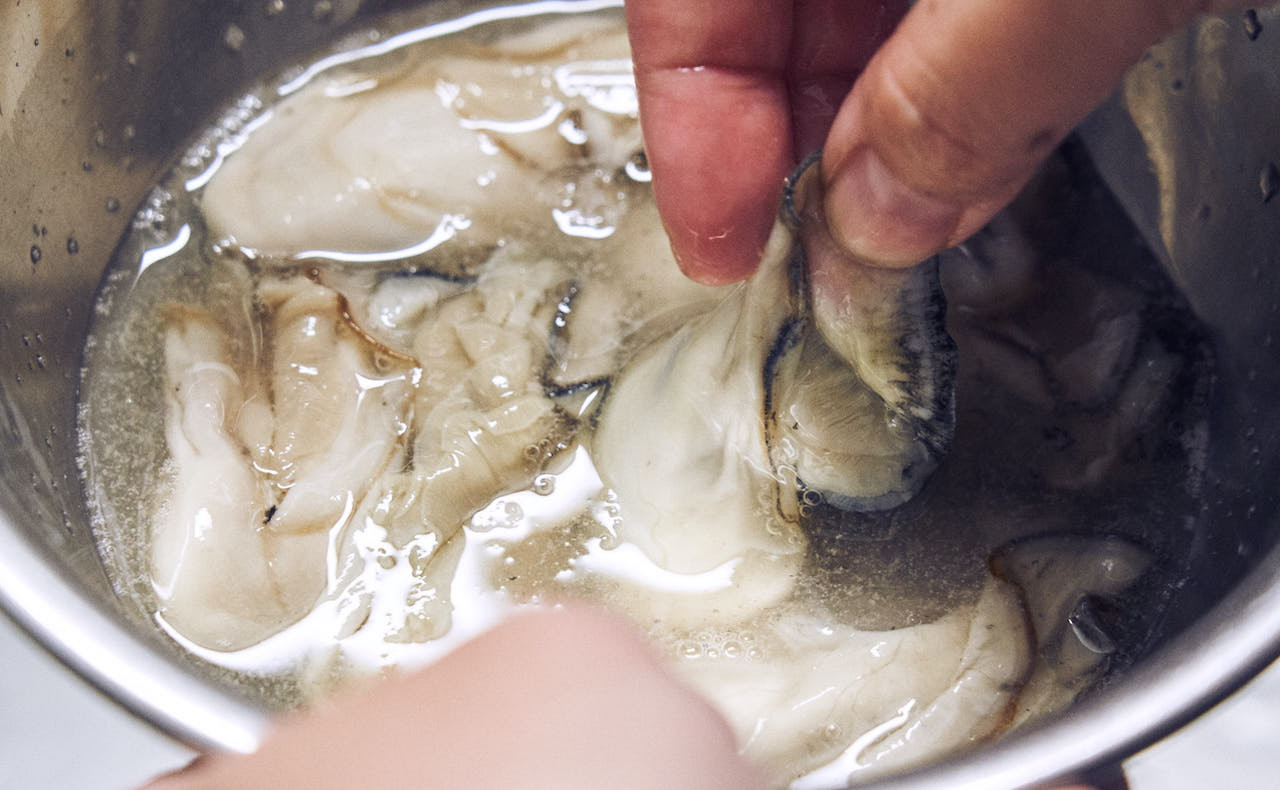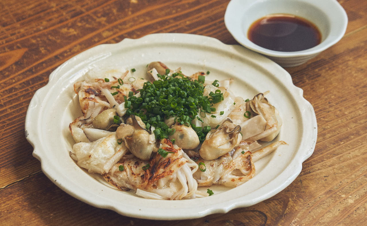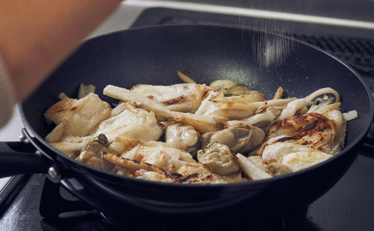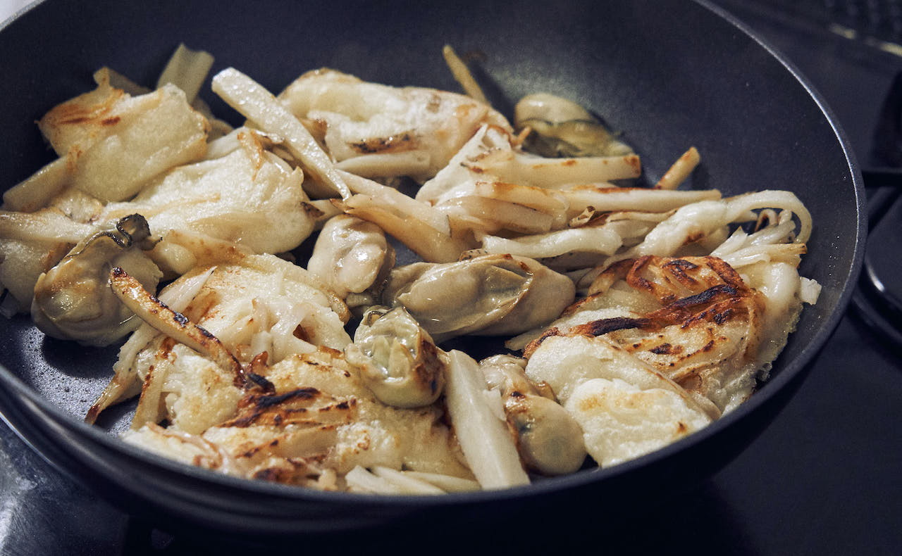 冬が旬の「牡蠣」とお餅を合わせたらピタッとハマりました。牡蠣は旨みエキスたっぷりなので、余計な足し算はせず、シンプルに塩のみで味付けます。チーズのように、れんこんに絡むお餅の食感は、一度食べたらきっとクセになりますよ。牡蠣は砂抜きもしなくていいし、フライパンひとつで簡単に作れます!