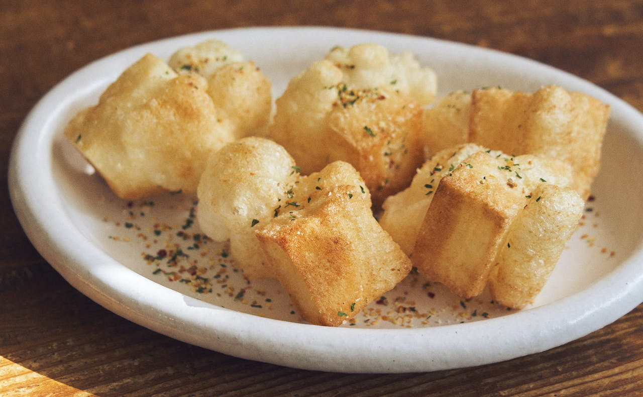 揚げたお餅はガーリック塩と相性抜群! おうちで余っているスパイスをぜひ使ってください。外はカリッと、中はもちっとしていて、スナック感覚で楽しめるので、食べ出したらノンストップです。紙袋に入れて、青のりと塩でシャカシャカお餅にしてもおいしいですよ。カロリー爆弾ですが……(笑)