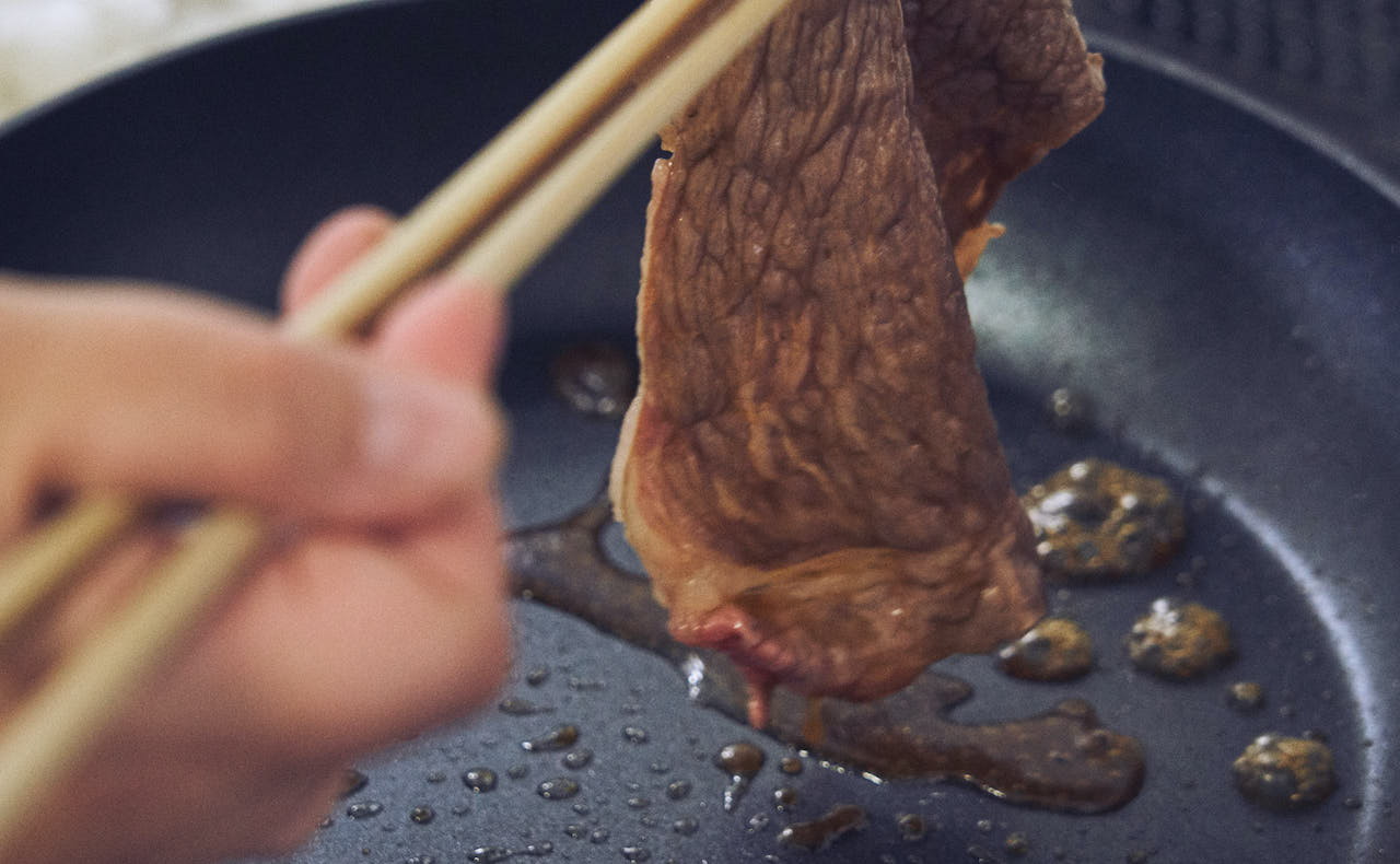 ここで、ご馳走アイテムの投入です。すき焼きダレで甘辛く焼いた牛肉で焼き餅を包んでいただきます。一つでも豪華食材を入れると、お餅パーティーがいっそう華やぎますよ。