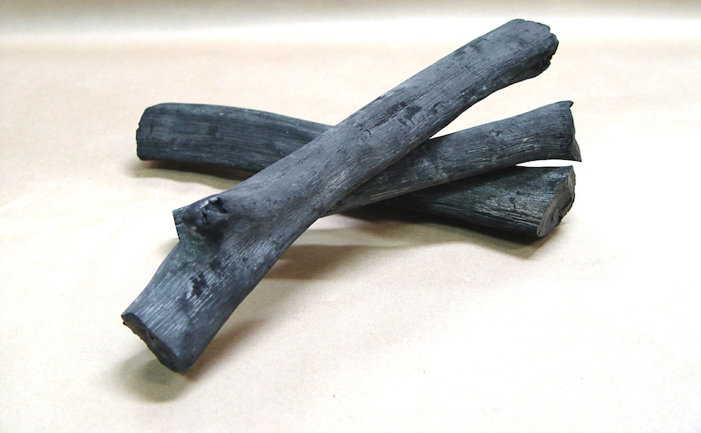 「天然炭も炭化方法(炭の作り方)によって、『黒炭』と『白炭』に分けることができます。樹木を燃やすまでは同じ製法ですが、最終段階で窯口を土などで密閉して、空気の流入を止めて消火したものが黒炭です。一方、白炭は炭窯から火のついた状態で樹木を引き出し、消し粉と呼ばれる灰をかぶせて消火しています。白炭は、断面に割れ目が少なく、光沢があることが特徴です」