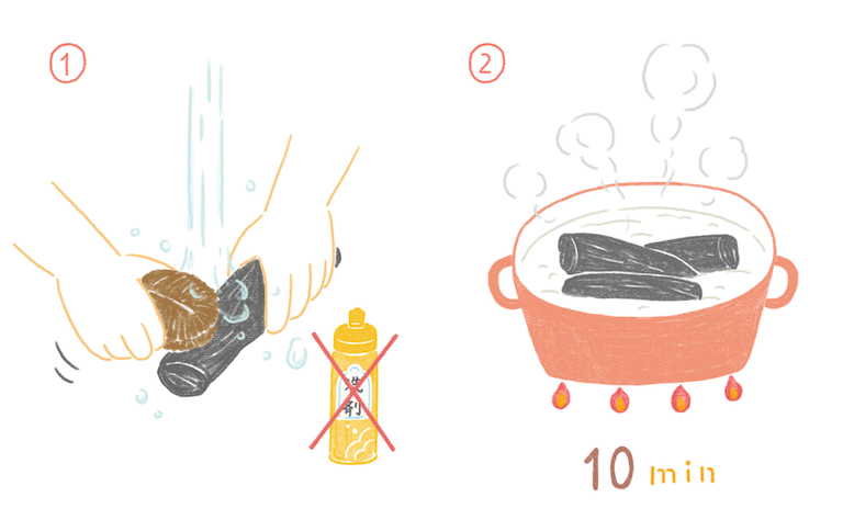 炭の表面についた汚れを、タワシと流水でしっかり落とす。洗剤は使用しない。