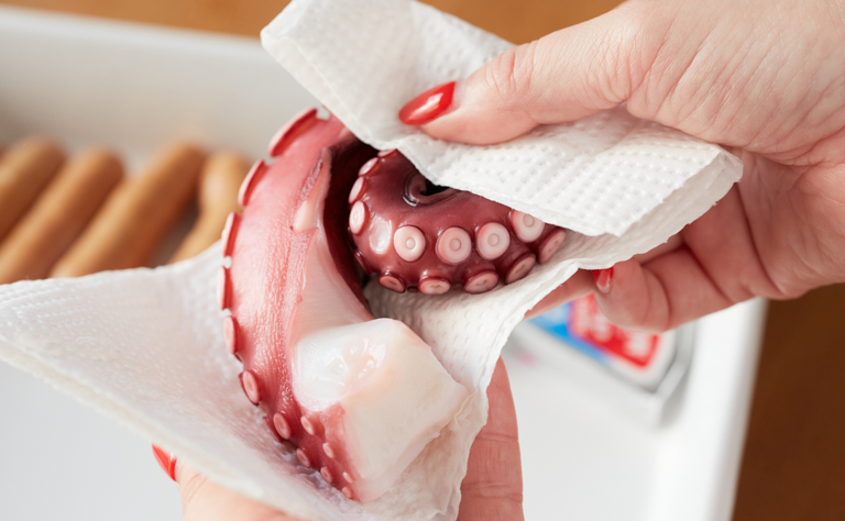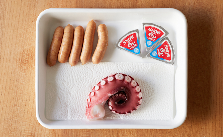 2.燻製したタコとプロセスチーズを食べやすい大きさにカットする