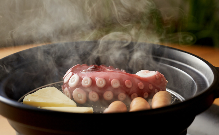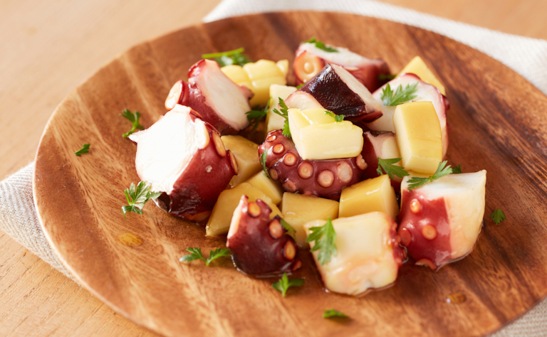 タコとチーズ、オリーブオイルのすべての材料に燻製をかけているから、食べた時のスモーキーな香りが一段と強く、深みのある味わいに。ビールはもちろん、ウイスキーやオレンジワインとも相性のいい一品です。
