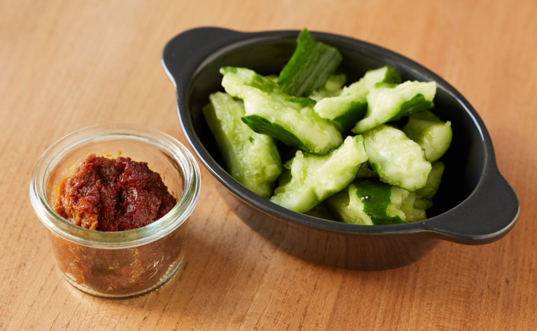 叩いたキュウリを、燻製させた味噌にディップしていただく。