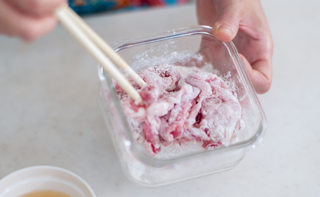【5】フライパンに残りのごま油(大さじ1)を加え熱し、豚コマ肉を炒めて肉の色が変わったら、【1】のゴーヤーと、細切りにんじんを加え炒める。