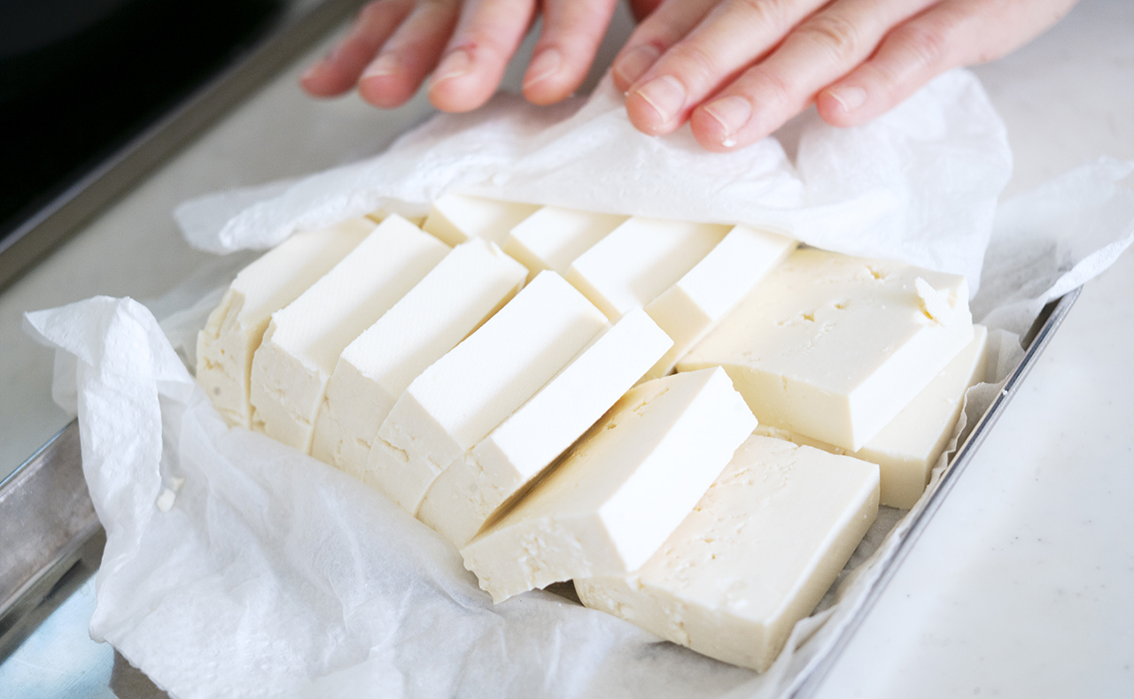 【3】木綿豆腐は食べやすい大きさにきり、キッチンペーパーで抑えて水気を拭き取る。