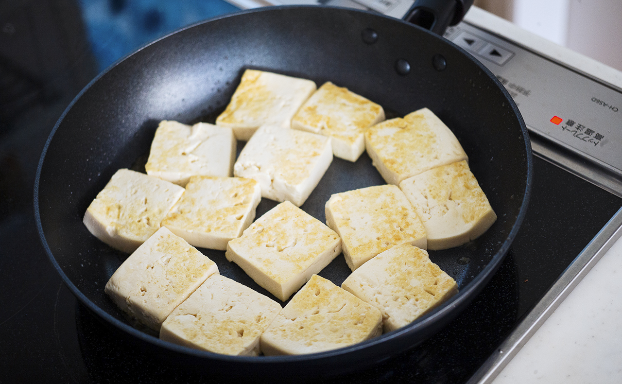 【4】フライパンにごま油(大さじ1)を入れ熱し、木綿豆腐を加えて両面焼き、焼き色がついたら一度取り出す。