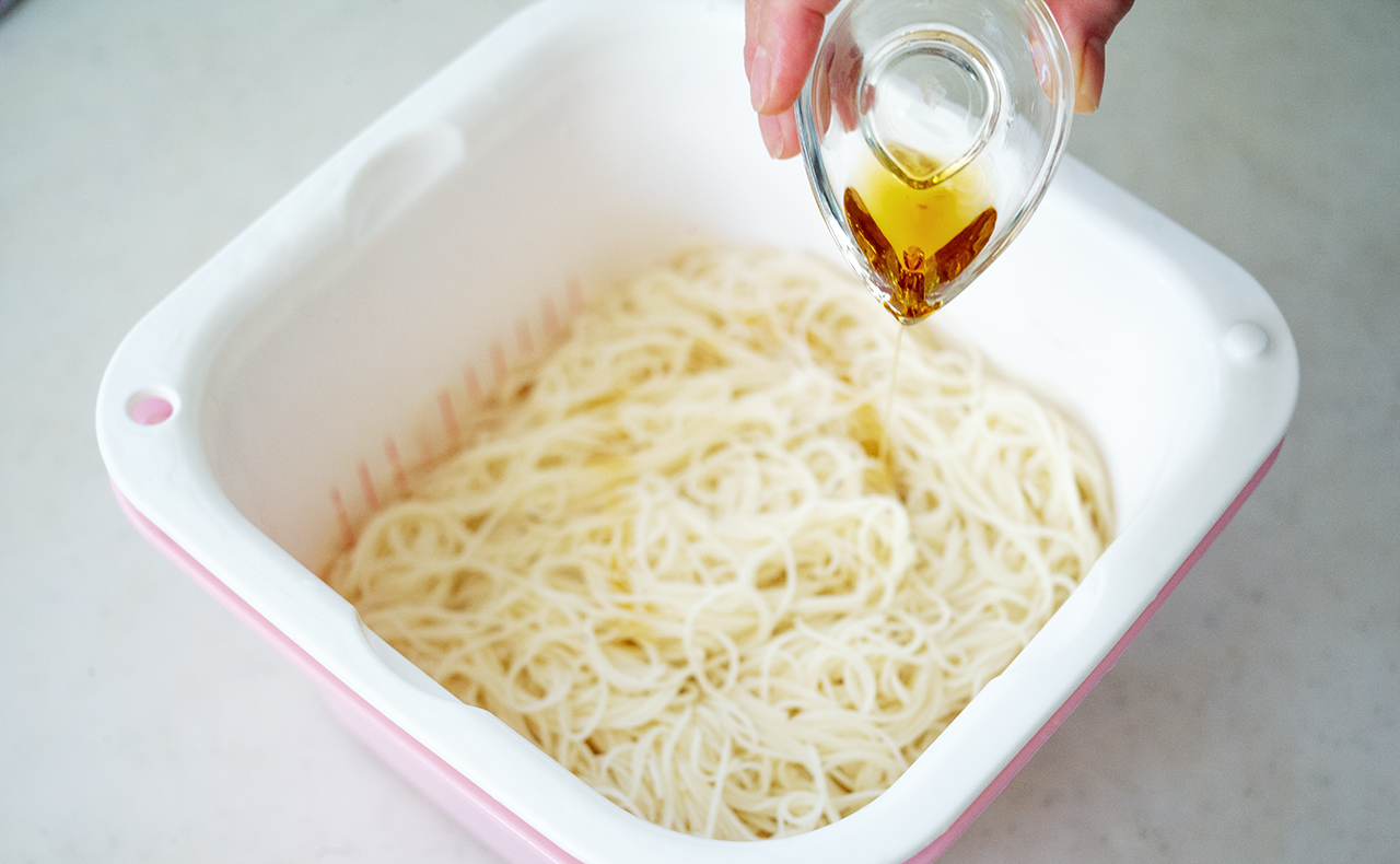 【2】茹で上がったそうめんは水で軽く洗ってザルで水を切り、ごま油を全体に回しかけて混ぜ合わせる。