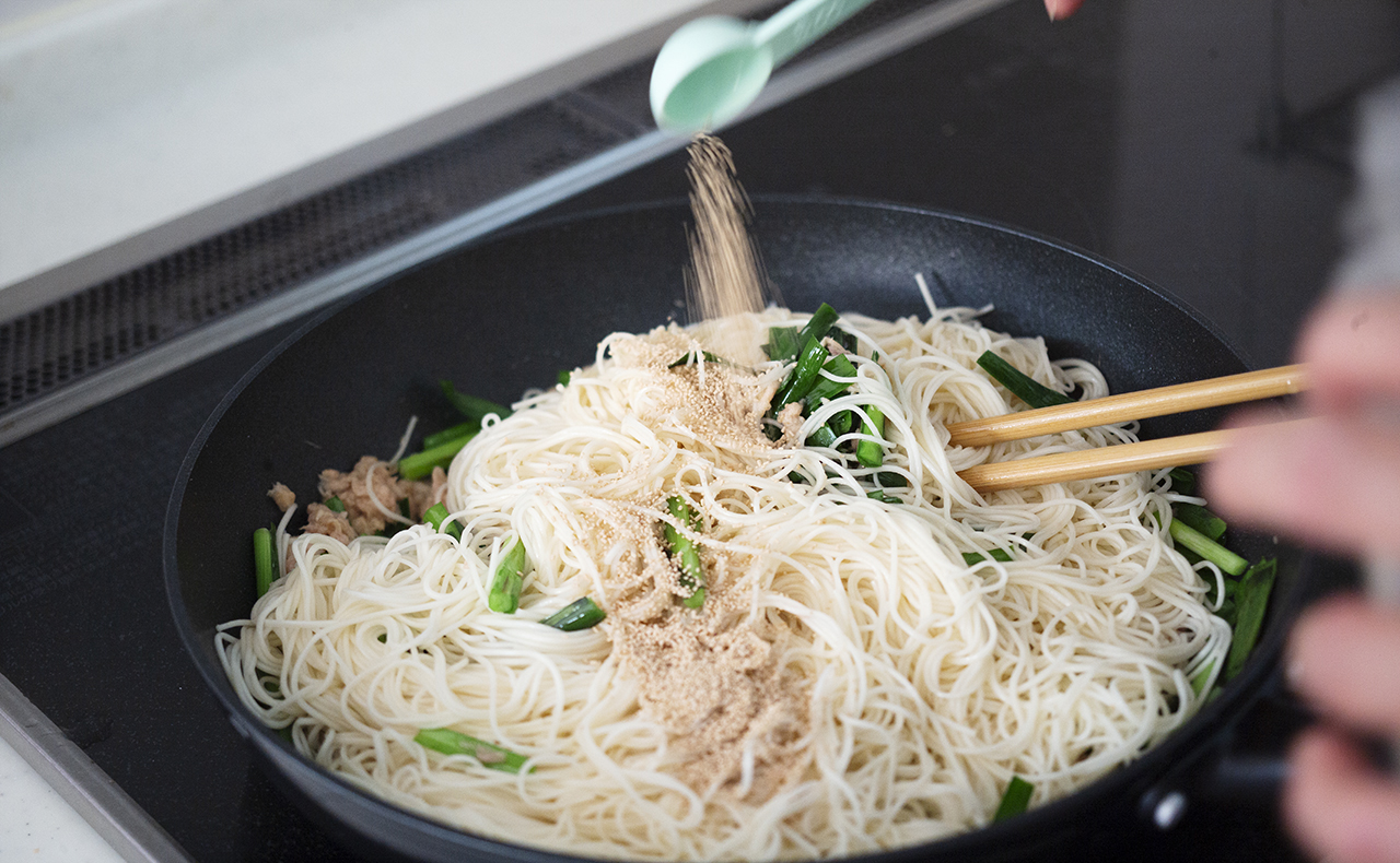 昔ながらの作り方だとネギと塩のみのシンプルな味付けが多いですが、今回はツナとニラを加えてバランスの良いレシピをご紹介します! キハダマグロ系のツナ缶だと、より旨味を感じますよ。茹でたそうめんにごま油をまぶすと、さっと炒めやすくなります。
