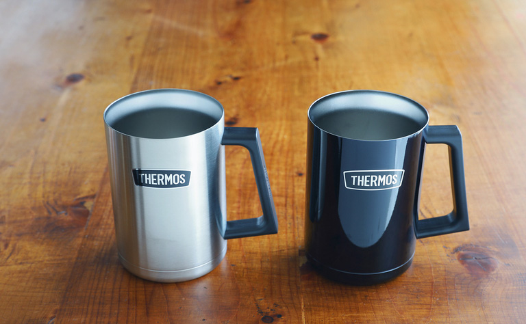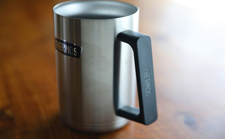 一般的なマグカップと比較すると、600mlのジョッキは大きく感じますが、持ちやすい形状のハンドルのおかげであまり重さは気になりません。「ハンドルのデザインやサーモスのロゴもおしゃれですね♪」