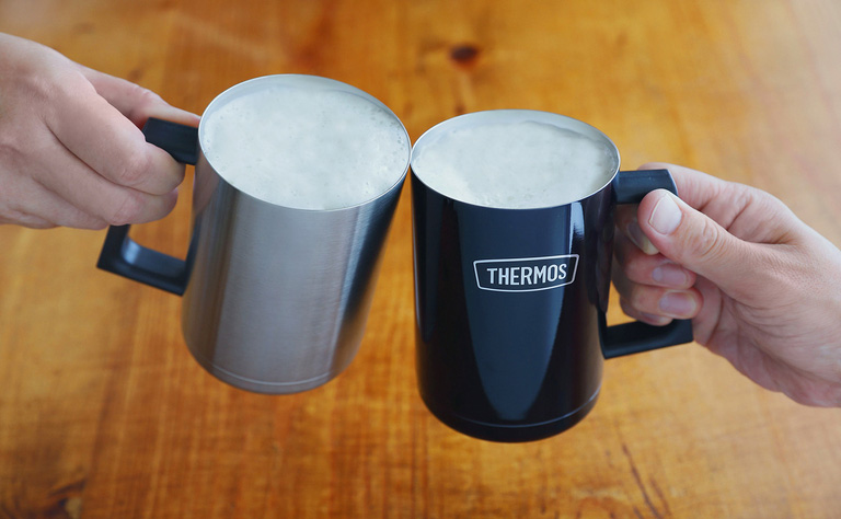新登場した「真空断熱ジョッキ(ROD-008)」は内容量600 ml、高さ13.5cmと、大きめのアウトドア仕様。ステンレス製魔法びん構造で冷たさを長時間キープできます。また、液体の温度が外側に伝わりにくいため結露しにくく、テーブルの上がびちゃびちゃ…なんて心配も無用です。