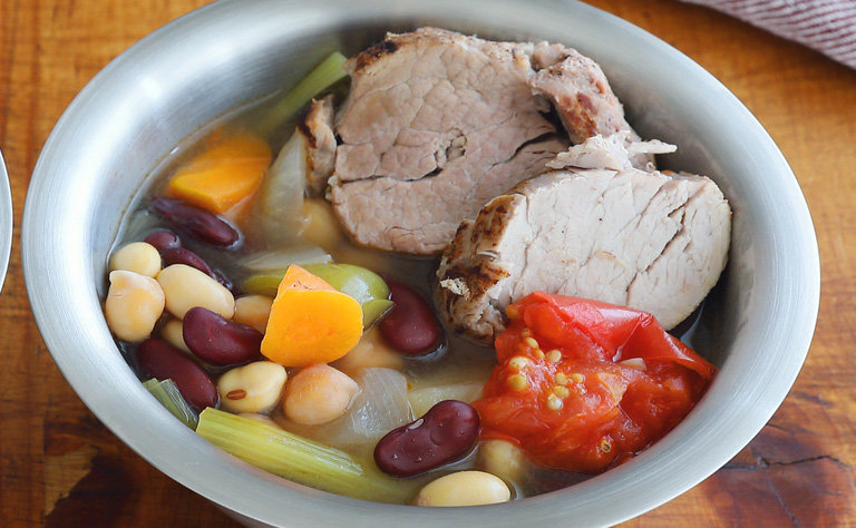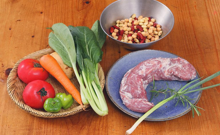 野菜は食べやすい大きさに切り、豆は前の晩から水で戻しておきます。いつもはトマトホール缶を使うそうですが、夏なので生のトマトに。豚ヒレ肉は塩麹をまぶして一晩おきました。