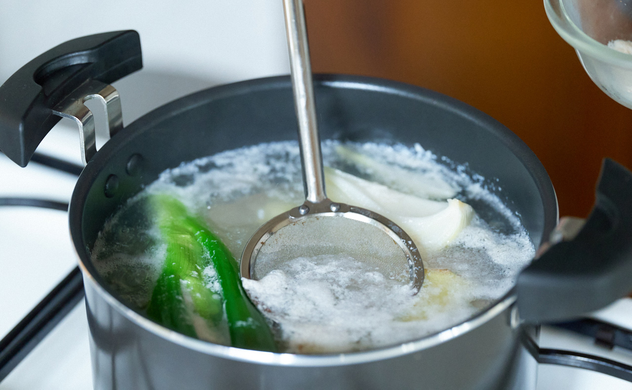 【1】 調理鍋に【A】と7分目程度の水を入れて強火にかけ、沸とうしたらアクを取る。