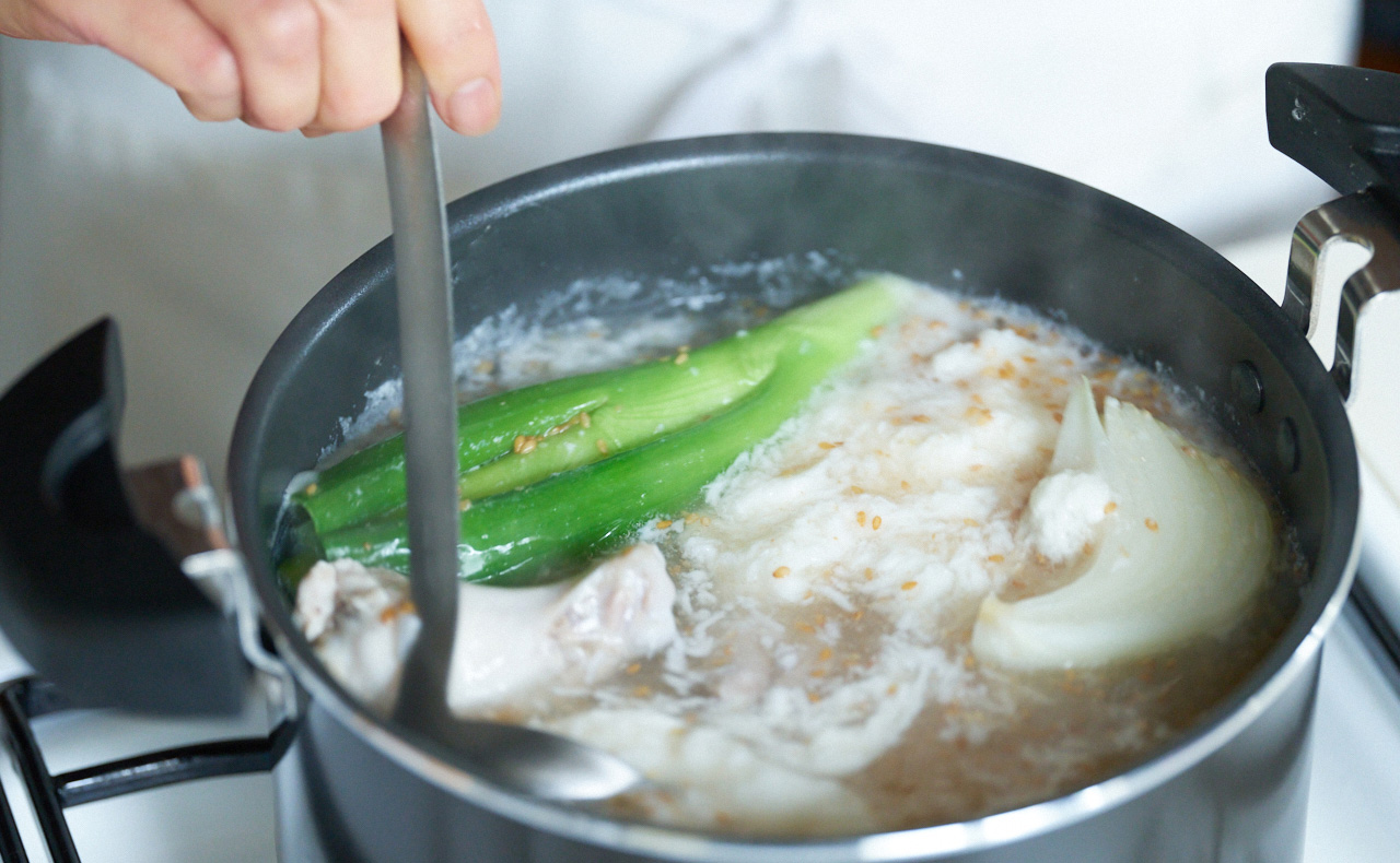 鶏肉はお好きな部位でOKですが、今回は手羽元ともも肉を使っています。骨付き肉を入れるとコクと旨味が出るのでおすすめです。アクをしっかり取り除くことがおいしく作るためのポイント!