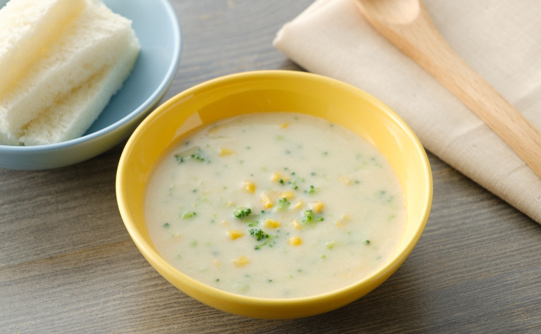 ささみとさつまいもを使った、優しい味わいのポタージュスープは、パンにもご飯にも合うお味。コーンやブロッコリーを散らして、彩りもきれいに仕上げました。