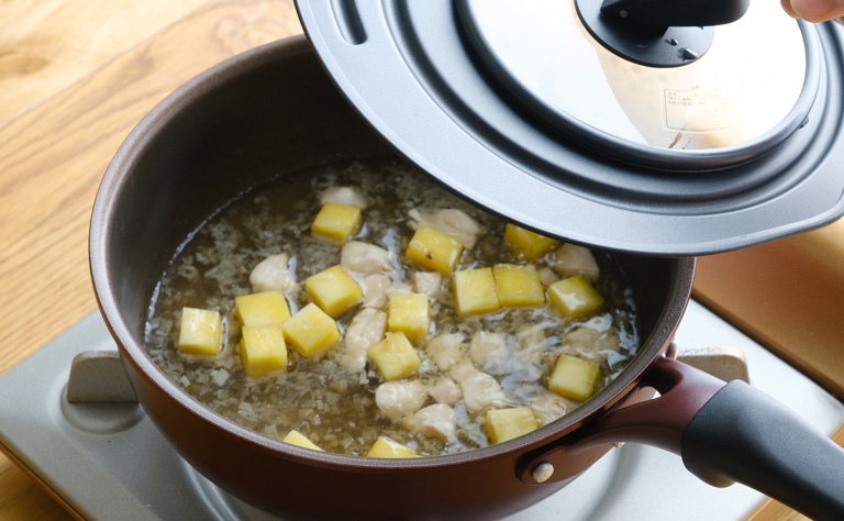 【3】だし汁を加え、やわらかくなるまで煮る(沸とう後、フタをして弱火〜中火約7〜8分)。