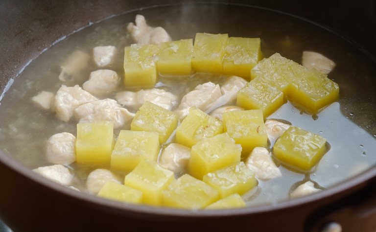 お肉にちゃんと火が通ればOK。このあとだし汁で煮込むので、さつまいもには完全に火を通さなくても大丈夫です。