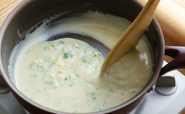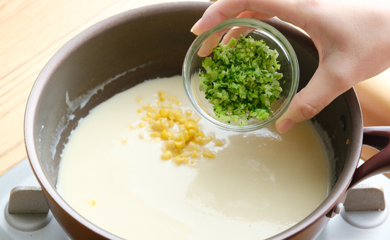 【5】4を鍋に戻し入れ、牛乳、ブロッコリー、コーンを加え、弱火~中火で混ぜながら温める。