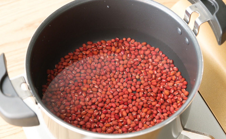 【1】小豆を水で洗う。小豆と4カップの水をシャトルシェフの調理鍋に入れて中火にかける。沸とうしたら2~3分ゆで、ゆでこぼす。