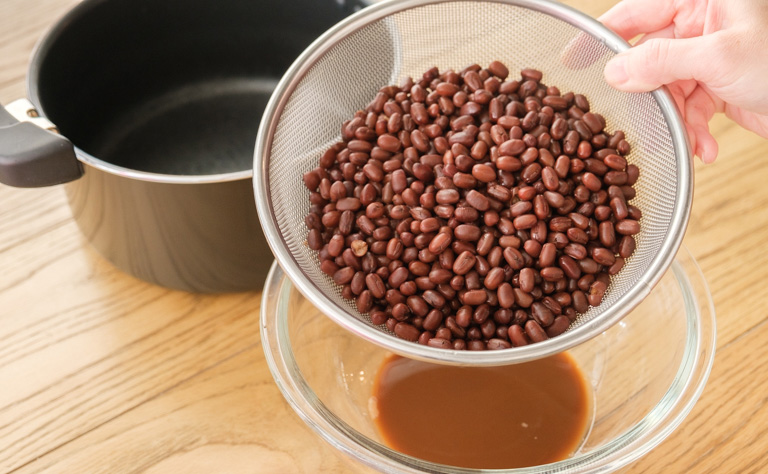 【4】小豆はザルにあげ、ゆで汁は取っておく。 小豆は熱いうちに調理鍋に戻す。