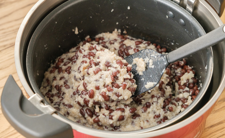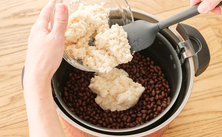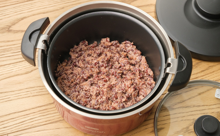 シャトルシェフは、小豆の状態を見ながら火にかけたり保温容器に入れたりできるのがいいですね。小豆が炊けたら、次は戻した米こうじと合わせて仕上げていきます!