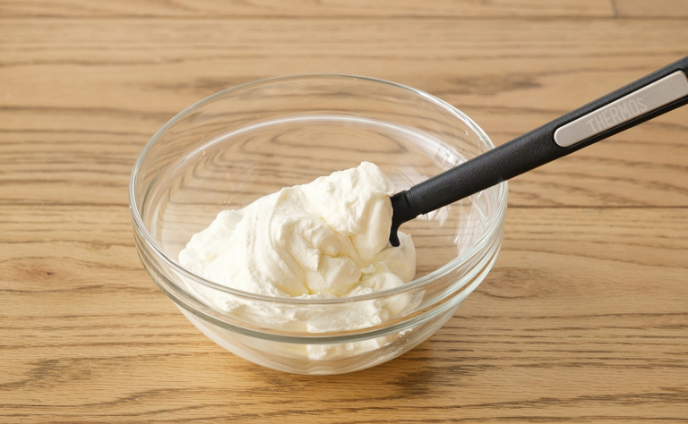 【1】生クリームをボウルに入れ、泡立て器で8分立てにし、はちみつを入れて混ぜる。
